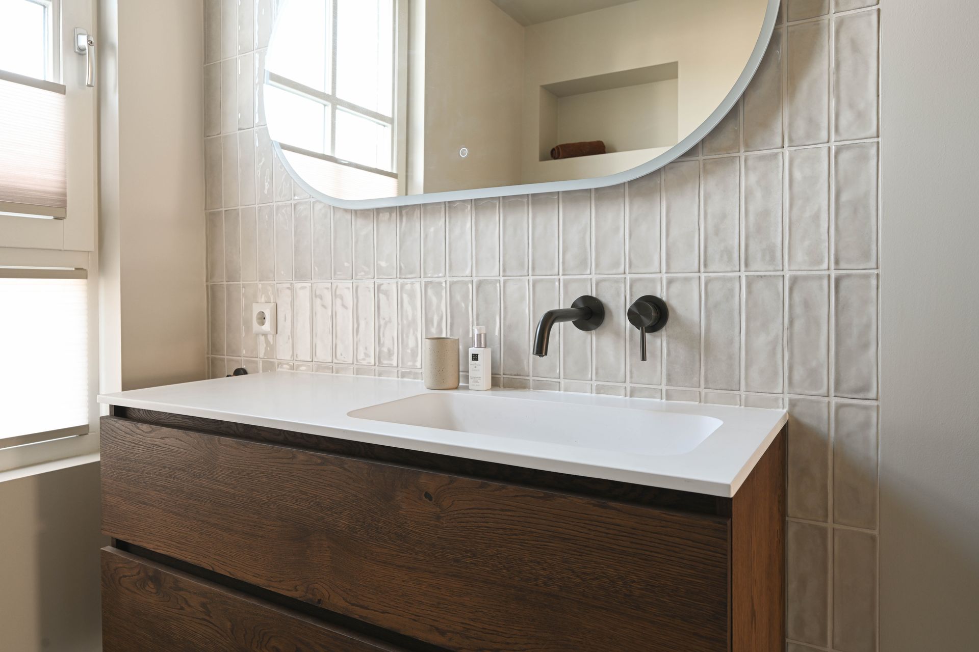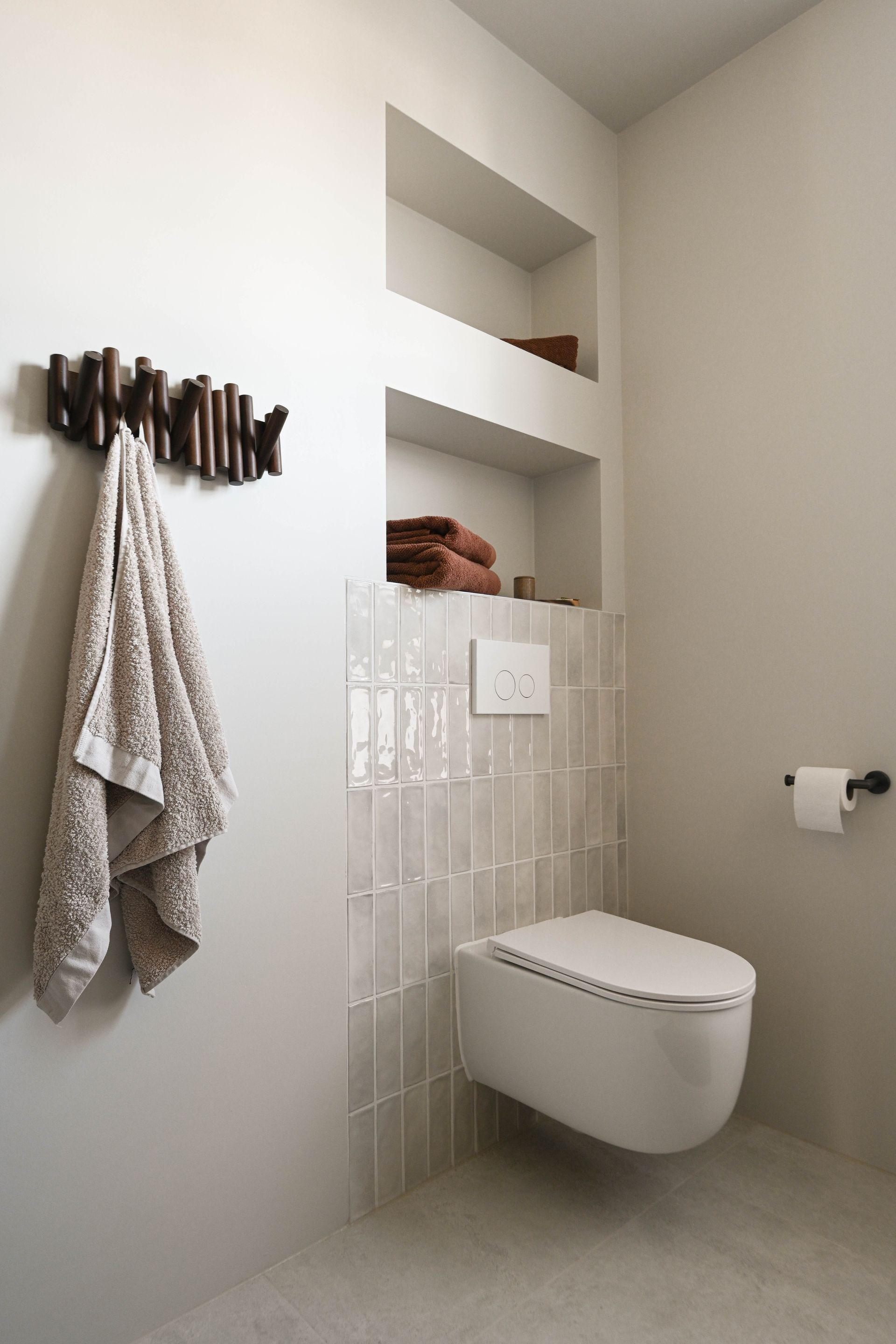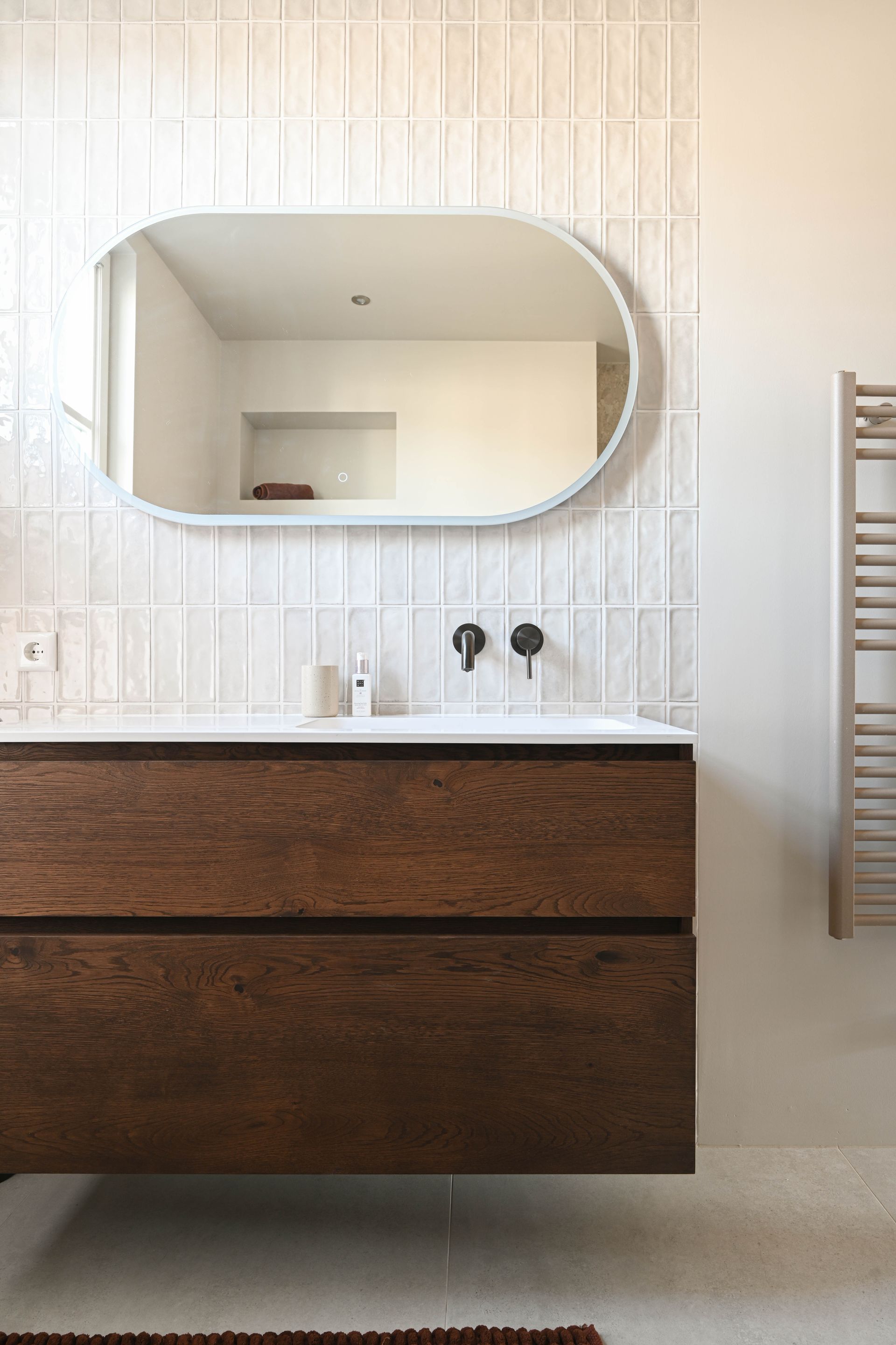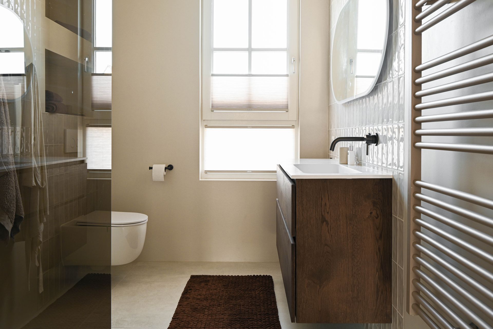 Voor de badkamer in een nieuwbouwwoning mocht ik een totaalontwerp maken. Het moest een badkamer worden in een japandi sfeer, met stoere elementen. Er zijn natuurlijke materialen gebruikt, lichte tinten en een mix van texturen en afwerkingen. De stoere elementen komen terug in de donkere kleuren, onder andere het gunmetal in de kranen en accessoires, het donkere hout en het bruine linnengoed. Het is een heerlijke badkamer geworden die luxe, warmte en rust uitstraalt.