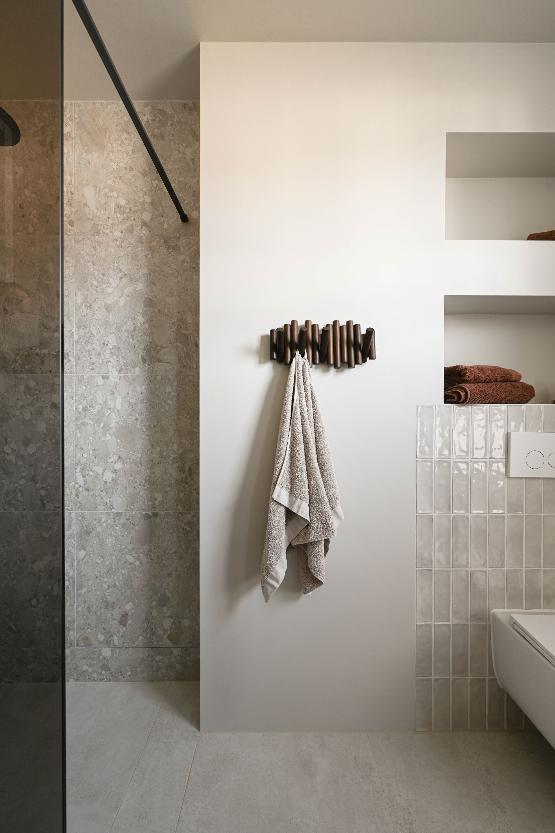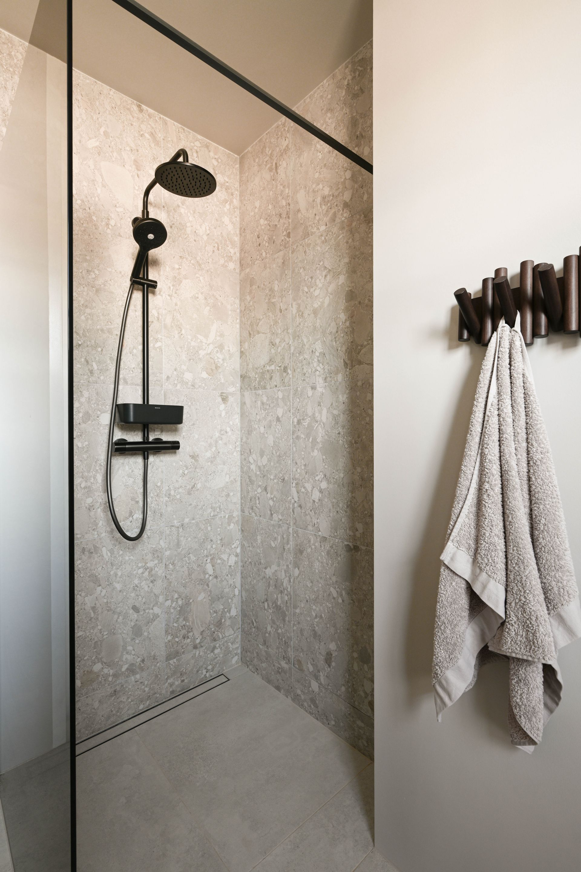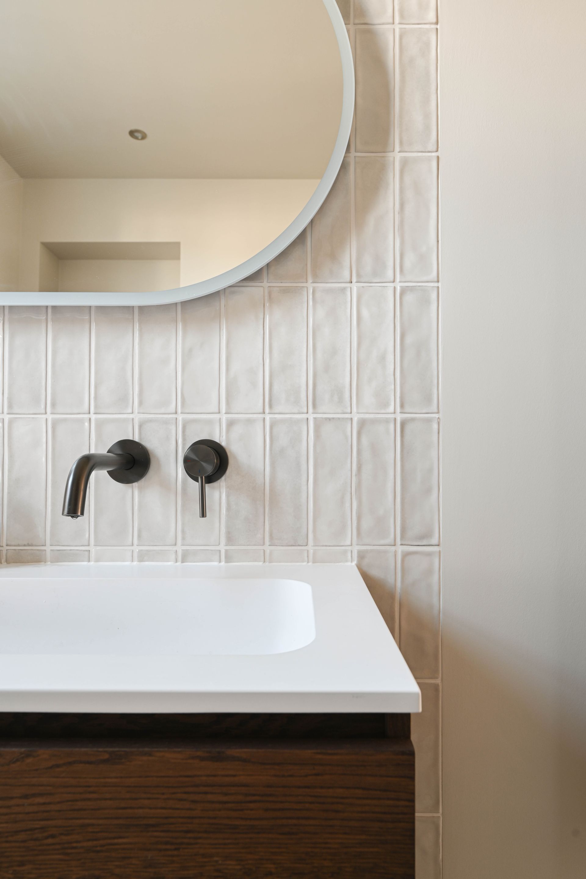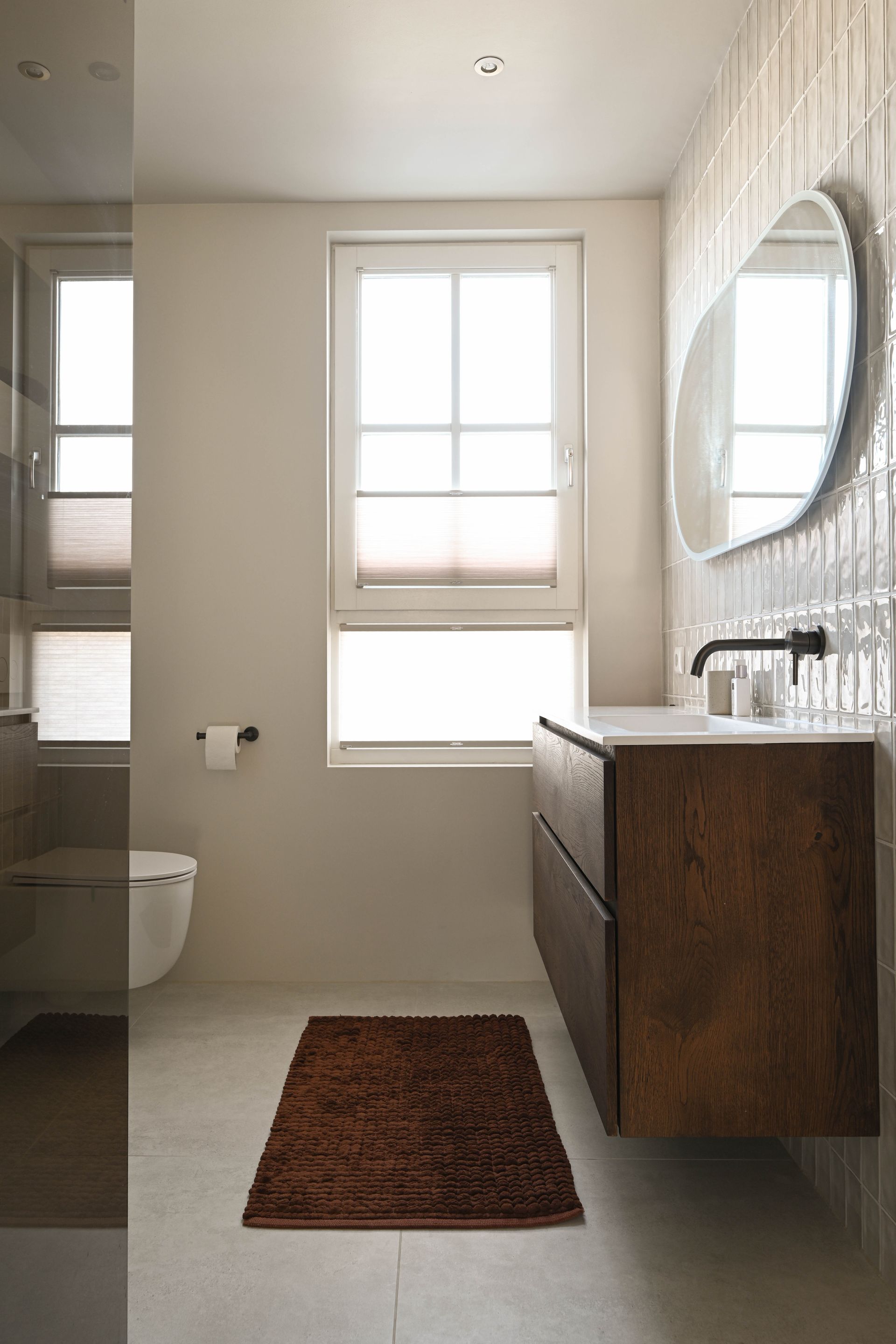 Voor de badkamer in een nieuwbouwwoning mocht ik een totaalontwerp maken. Het moest een badkamer worden in een japandi sfeer, met stoere elementen. Er zijn natuurlijke materialen gebruikt, lichte tinten en een mix van texturen en afwerkingen. De stoere elementen komen terug in de donkere kleuren, onder andere het gunmetal in de kranen en accessoires, het donkere hout en het bruine linnengoed. Het is een heerlijke badkamer geworden die luxe, warmte en rust uitstraalt.