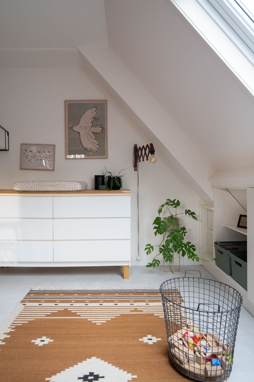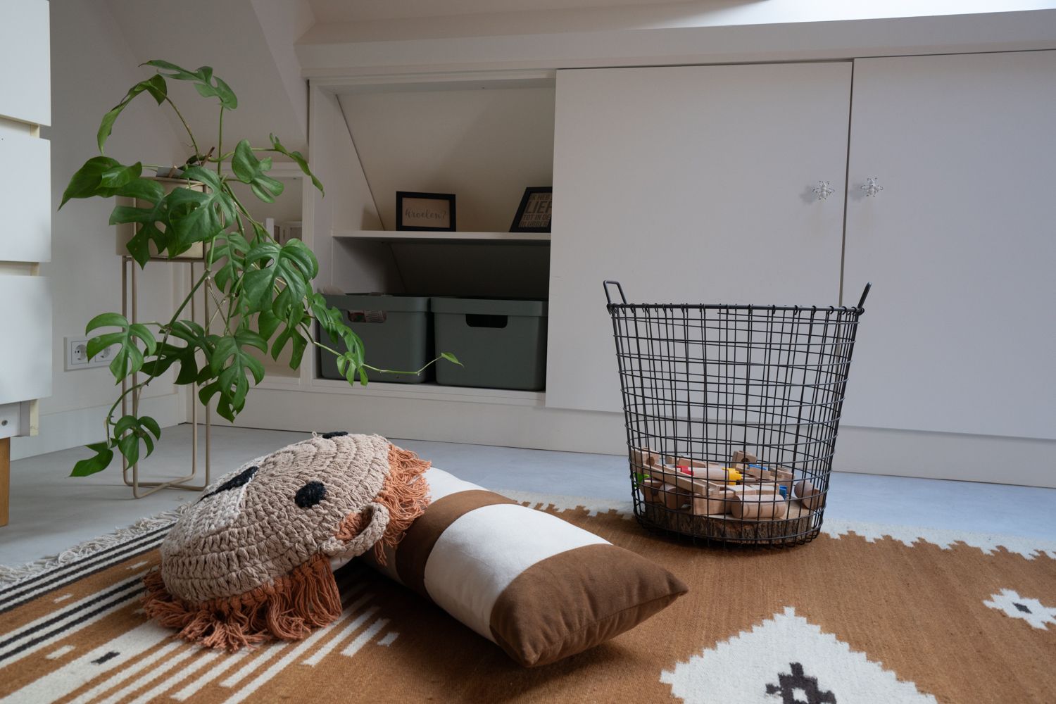 Voor de slaapkamer van een dreumes gaf ik een stylingadvies. De meubels en de kleur op de muur vormden een fijn uitgangspunt. Met accessoires heb ik de ruimte verder aangevuld en meer eigenheid gegeven. De wens was een levendige jongenskamer te creëren met genoeg ruimte om te spelen, maar wel met behoud van die rustige uitstraling. Het vloerkleed nodigt uit om lekker op te spelen. Daarnaast heb ik accessoires zoals posters en speelgoedopbergers toegevoegd. Hierbij heb ik de bestaande kleuren bruin en terracotta aangehouden en deze aangevuld met groen en blauw.