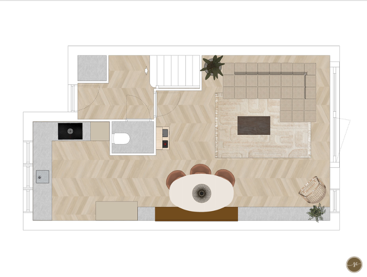 De woonstijl is een mix van Scandinavisch met boho en ibizastyle vibes. Natuurlijke materialen zoals rotan, hout, linnen en bamboe spelen hierin een belangrijke rol. De grijze plavuizen maakten plaats voor een warme eikenlook pvc-vloer en de wanden kregen zachte, warme tinten, gecombineerd met behang met een natuurlijk dessin. Kleuren als bruin, terra, zachtroze, oker en roomwit zorgen samen voor een rustig en warm geheel. Naast nieuwe meubels heb ik geadviseerd om de hoogglans witte keukenfronten te wrappen in een matte lichtbeige tint, zodat deze beter aansluiten bij de nieuwe sfeer. Daarnaast zijn raambekleding en verlichting zorgvuldig afgestemd op het totaalontwerp.