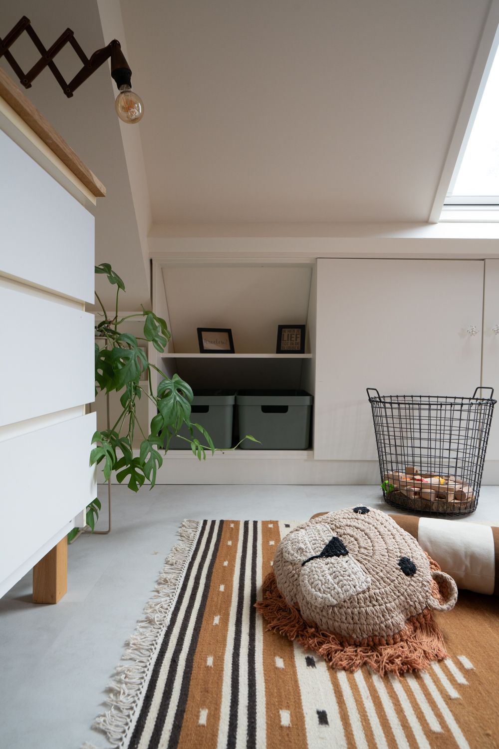 De slaapkamer was al voorzien van mooie (rustige) meubels en kleur op de muur. Mijn taak was om hier mooie accessoires bij uit te zoeken die deze sfeer aanvulden. De wens was om de ruimte te transformeren tot een levendige jongenskamer met een fijne plek om te spelen en tegelijkertijd de rustige uitstraling te behouden. Om dit te bereiken, heb ik het kleurenpalet uitgebreid met tinten zoals bruin, terra, groen en blauw. Daarnaast heb ik opbergruimte toegevoegd voor het speelgoed en een vloerkleed voorgesteld waarop volop gespeeld kan worden.