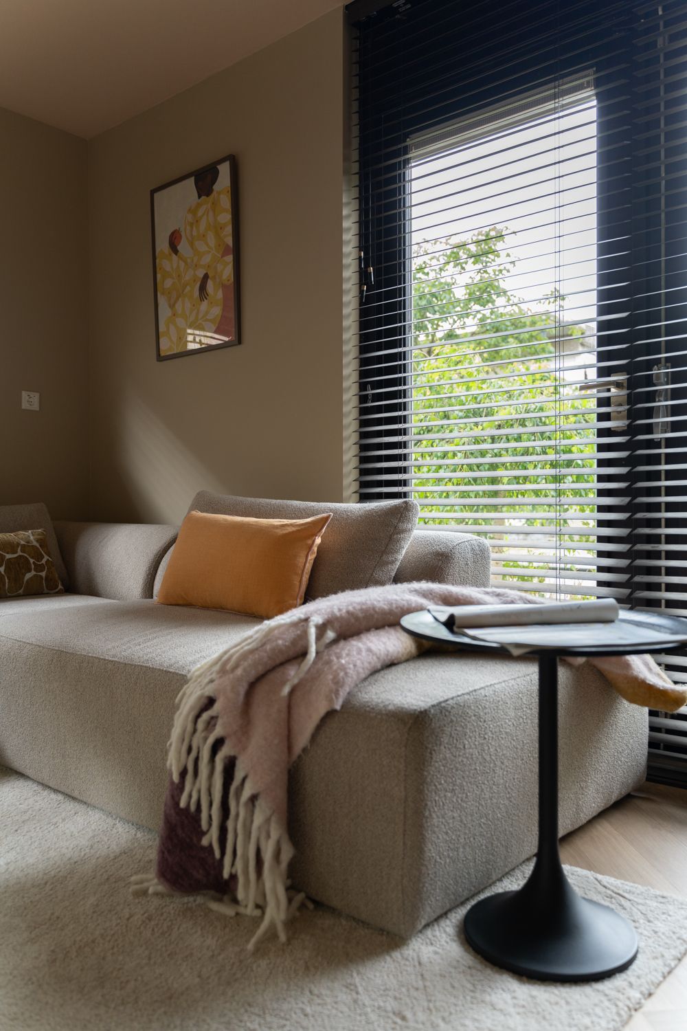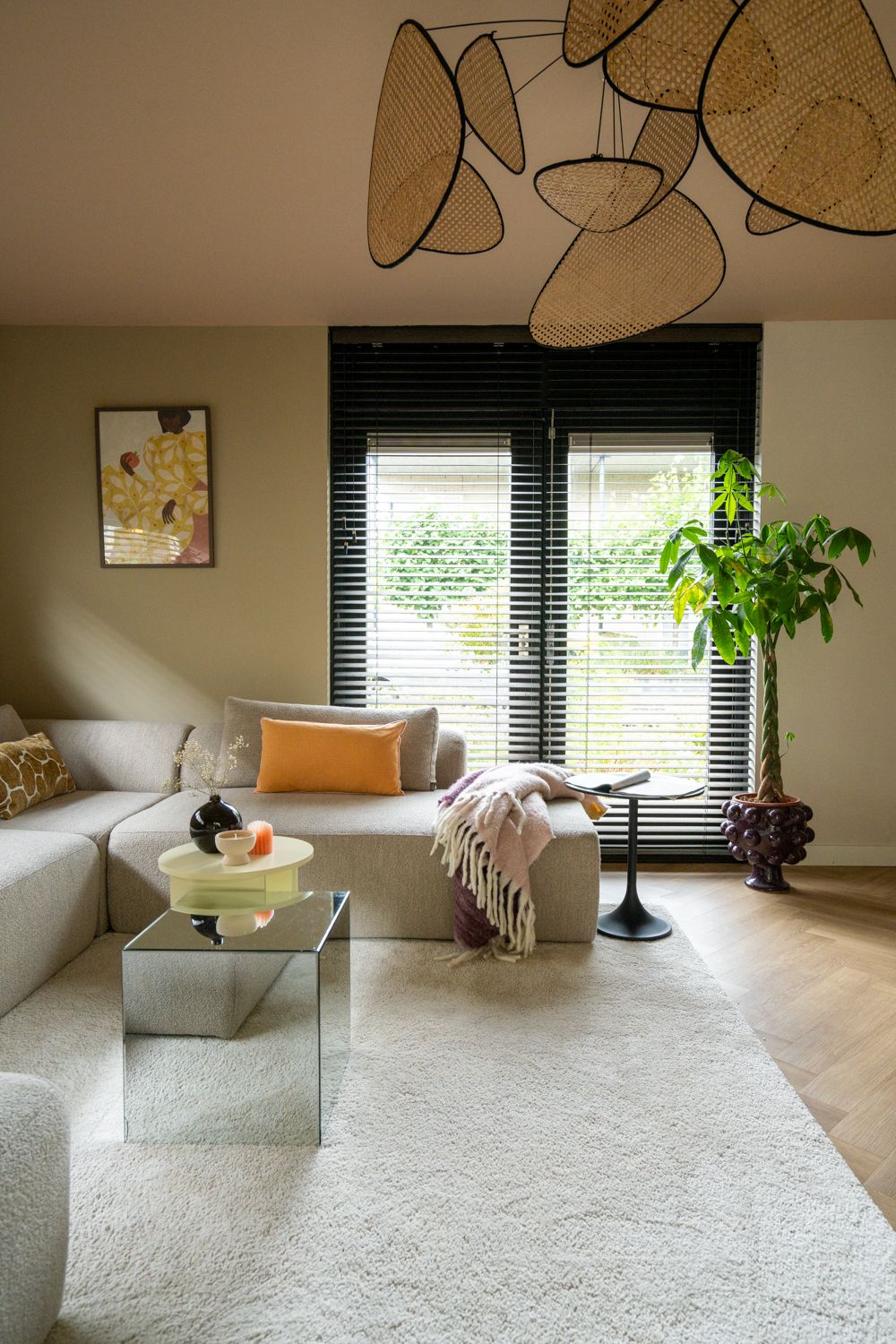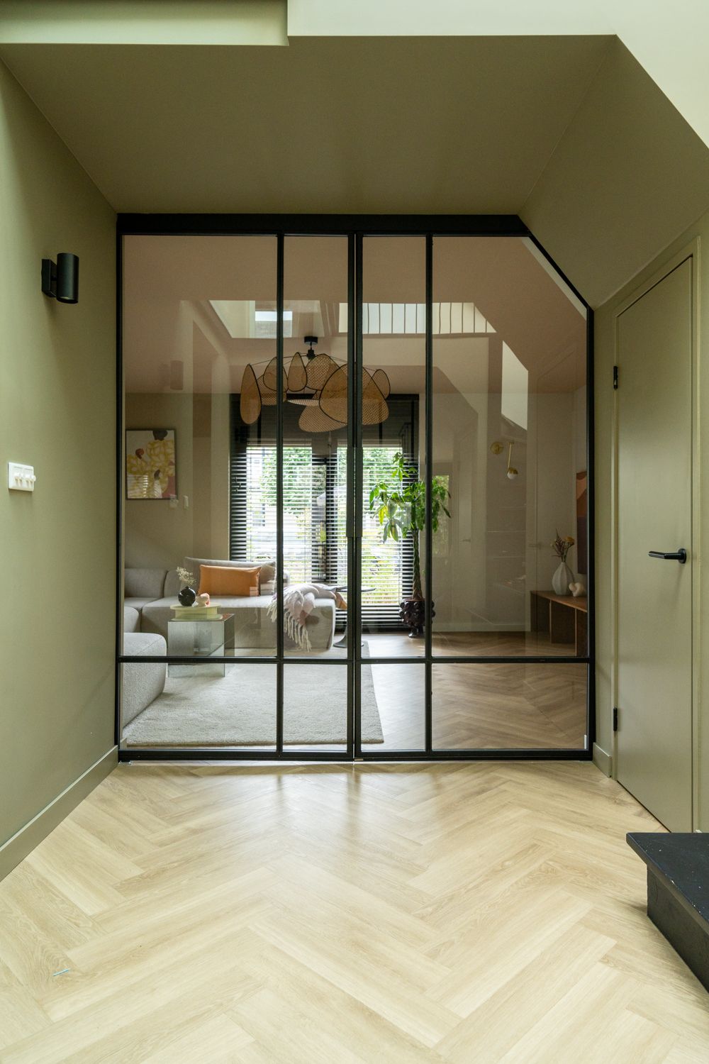 Er is gekozen voor warme kleuren op de wanden én het plafond. De kleur op het plafond versterkt de intieme en gezelliger sfeer, net als de stalen schuifdeuren waarmee de ruimte kan worden afgesloten. Kleuraccenten zijn verder verwerkt in de accessoires en ik heb gekozen voor een grote plafondlamp die de ruimte afmaakt.
