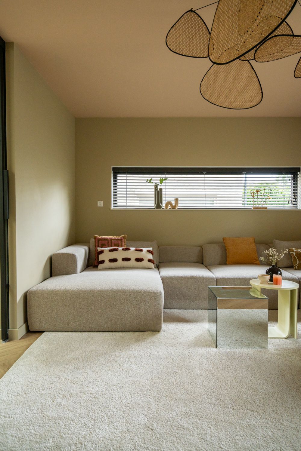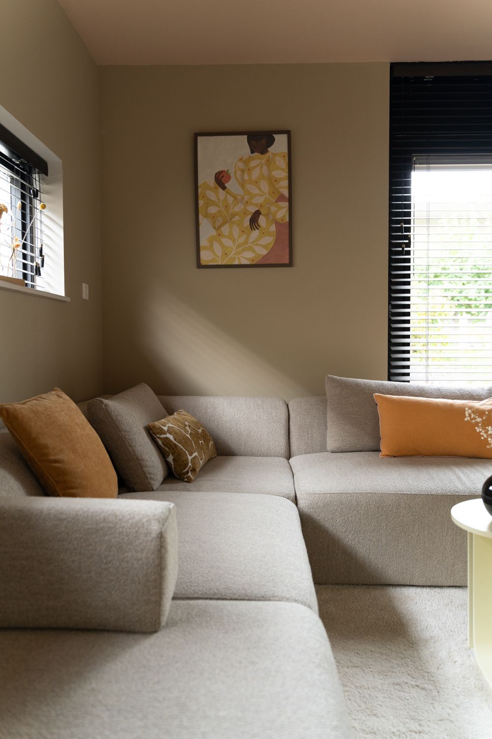 Welkom in onze fijne woonkamer, een perfecte plek om te ontspannen. De ruimte is ingericht met een grote, uitnodigende lounge-elementenbank, die centraal staat en uitnodigt tot bankhangen. Het modulaire ontwerp zorgt ervoor dat je kan spelen met de opstelling. In de zomeropstelling zoals op de foto’s, is de bank zo geplaatst dat de deuren naar de voortuin open kunnen. In de winter kan de indeling worden aangepast en creëer je een zithoek met zicht op de rest van het huis.